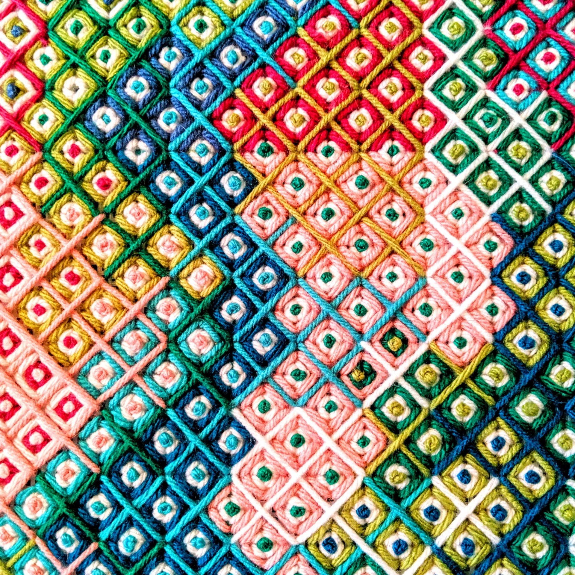 Meditation III: Tile. Jamie Lynn Lewin. 2020. Handstitched needlepoint of yarn on plastic canvas.